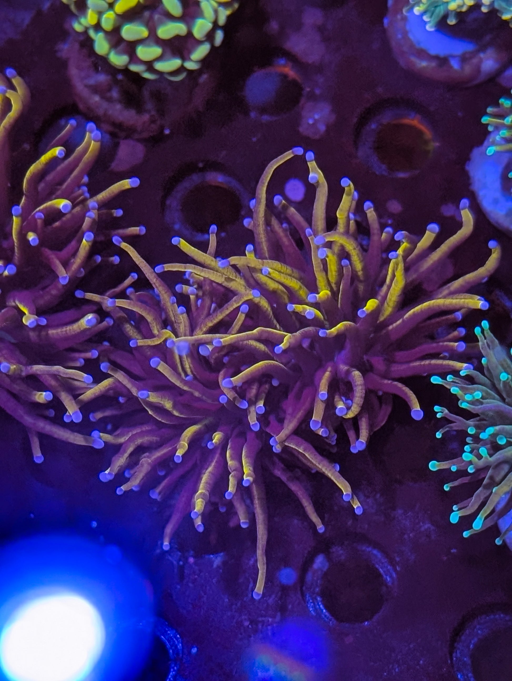 Elevate your aquarium with our stunning 24k Gold Torch Coral double head. This vibrant specimen features yellow tentacles with purple tips, creating a captivating display.